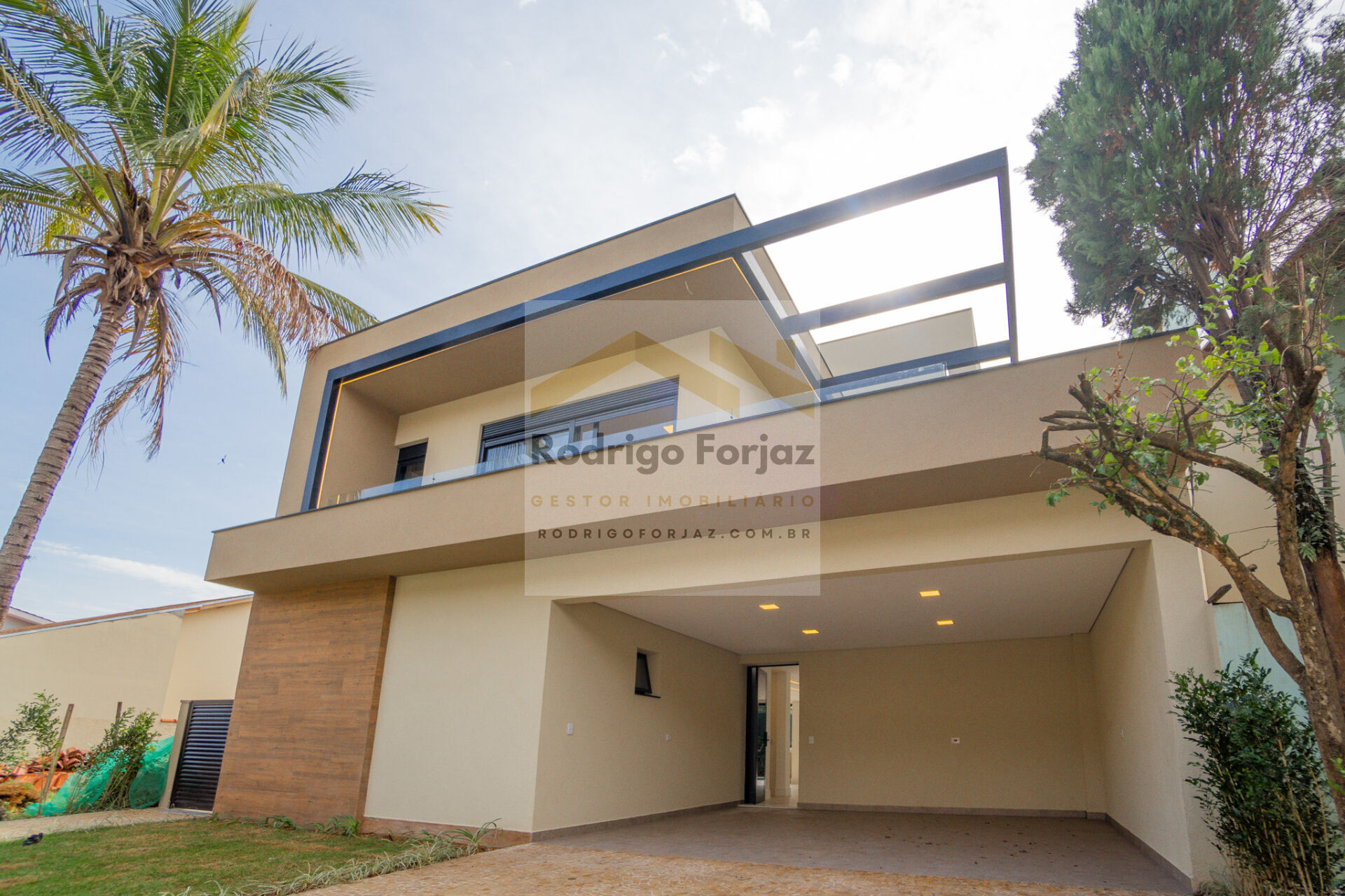 Linda casa, com projeto moderno de linha retas, fachada com painel em porcelanato madeira e pergolado em metal preto no terraço lateral proporcionando um visual arrojado.
