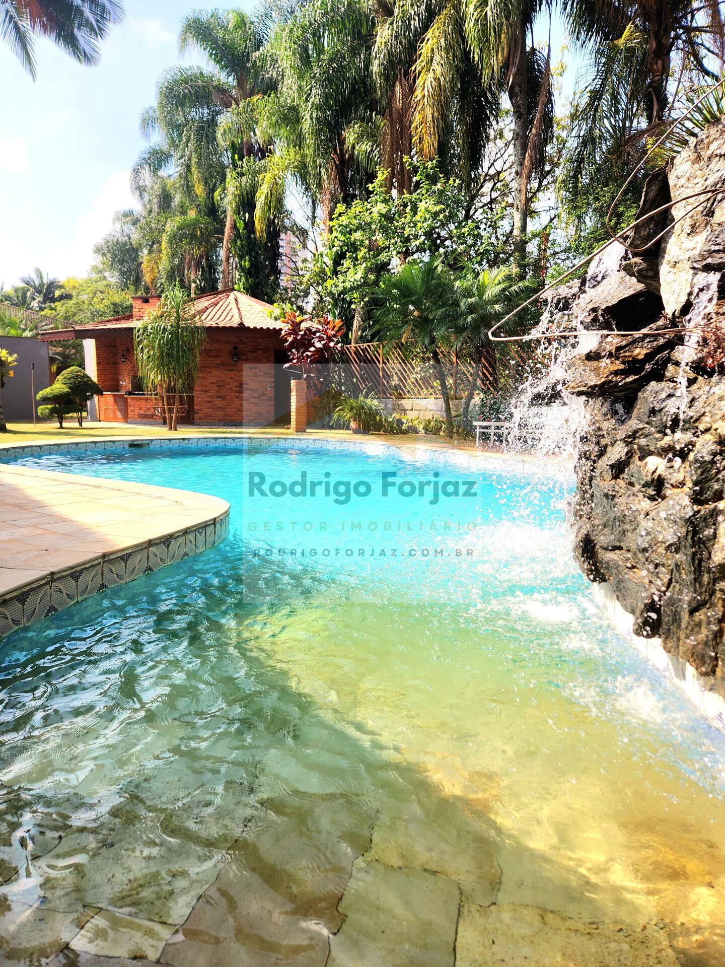 Belíssima área de lazer externa com piscina com cascata reservada, com grande incidência de Sol e total privacidade, Edículas cobertas na área de lazer com forno de pizza, churrasqueira, espaço para jogos, e chopperia. Banheiros na área externa. 01 Sauna, 01 depósito externo.